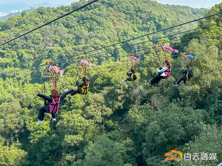 告别摩星岭,可以选择一种与上山截然不同的方式下山——乘坐“白云飞索”。这条全长1500米的滑索,是国内最长的高空滑索之一,从山巅直下山脚,高差达百米以上。