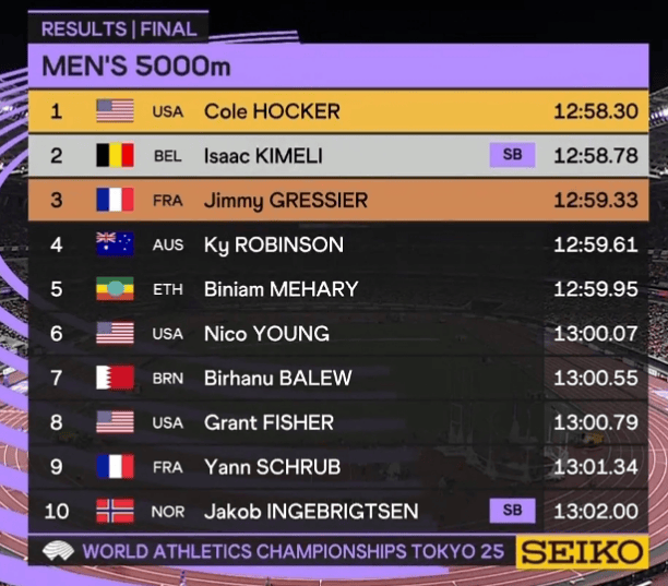 世锦赛男子5000米: 霍克12分58秒30夺冠, 英格布里格森第10