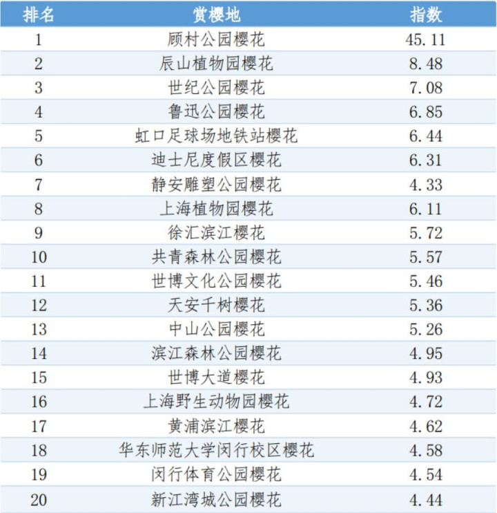 人民网上海4月10日电正值踏青赏春时节,上海多处迎来樱花怒放。哪一处是你心中最佳?4月10日,上海产业转型发展研究院与上海市花卉协会共同发布2026“上海樱花指数”,顾村公园、辰山植物园、世纪公园、鲁迅公园、虹口足球场地铁站等位列上海最佳赏樱地的前20名。