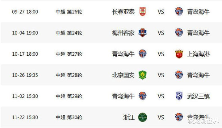 从海牛赛程可见,战罢亚泰,10月4日第24轮补赛客战梅州客家、10月11日第27轮迎战海港,10月26第28轮客战国安,11月2日第29轮主场迎战三镇,11月22日第30轮,客战浙江队。海牛最后6场,对手除了争冠队就是保级对手,浙江队也“六亲不认”,恐怕李霄鹏基本没有“江湖”可玩了!